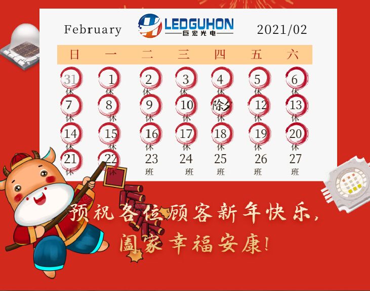 According to the actual situation of our company and in combination with national policies, Juhong 2021Chinese Spring Festival holidays is arranged as follows: